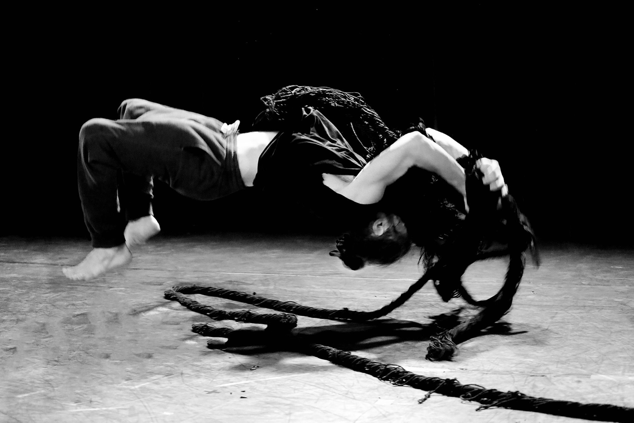 Un homme seul, sa chaîne stéréo et quelques vieux disques vinyles, le free-jazz d'Archie Sheep et Pharoah Sanders, revisite le blues des origines. Est-on dans une chambre d'ado, dans un studio de danse, au purgatoire...? Un peu tout ça sans doute. Il y a une corde aussi, pour se pendre ? Non plutôt pour grimper, serpenter, s’élever, danser... Une identité qui s'invente au gré de ses métamorphoses. On entend mieux la musique en regardant ce corps qui danse sur le fil.